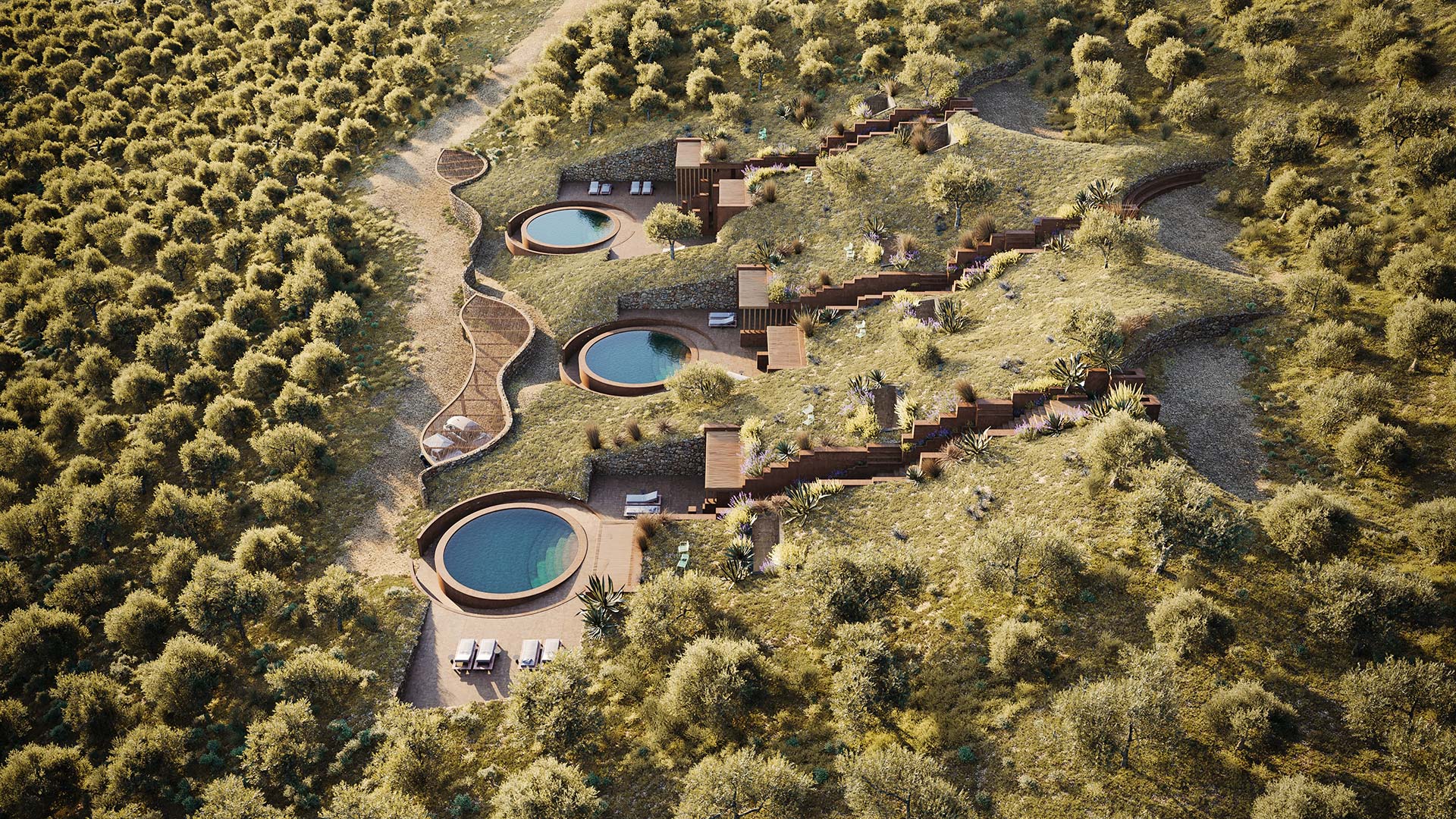 Κάθε τομή αποτελεί τον κοινόχρηστο χώρο των κατοικιών κάθε συγκροτήματος, ένω έχει δύο κυκλικές απολήξεις σε κάθε της “άκρο”. Στην εκκίνηση της διαδρομής από το parking ο κυκλικός χώρος δέχεται τις ράμπες ανόδου, ενώ στο επίπεδο των κατοικιών φιλοξενεί την πισίνα και τον κοινόχρησο χώρο συνεύρεσης των κατοίκων κάθε συγκροτήματος. Στην άνω απόληξη ο κύκλος “σβήνει” στο έδαφος και διαμορφώνεται ιδιωτικό για κάθε συγκρότημα belvedere για την απομόνωση και απόλαυση της πανοραμικής θέας φιλοξενώντας δράσεις πχ barbeque, κούνιες, χώρους κατάλληλα διαμορφωμένους για χαλάρωση κτλ.