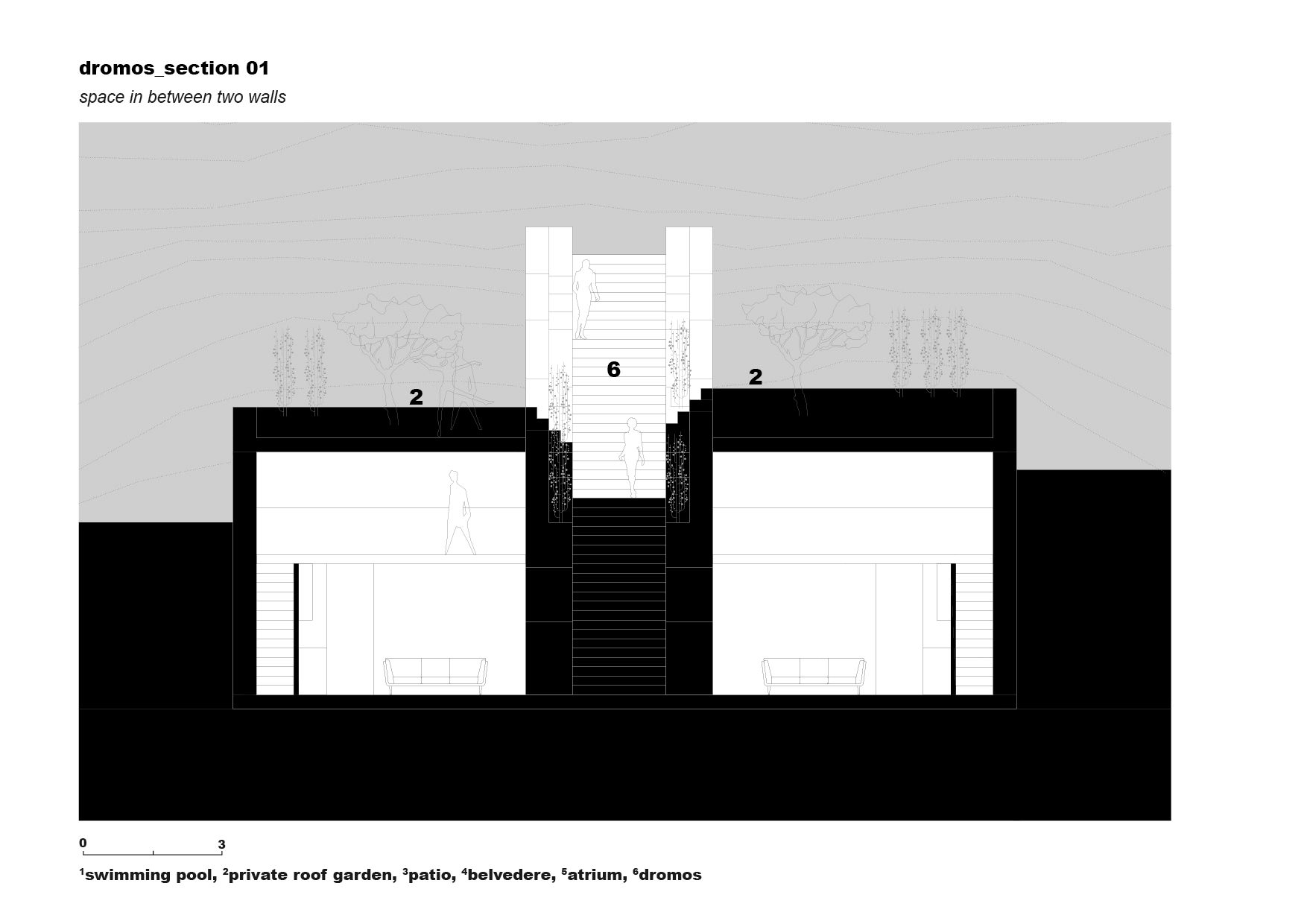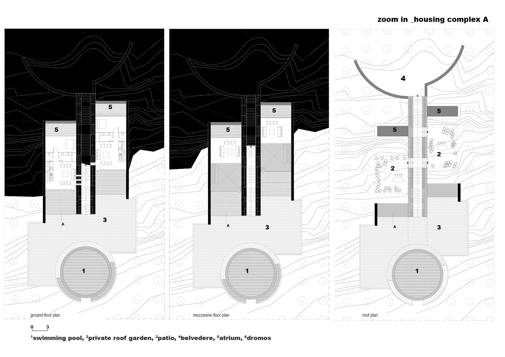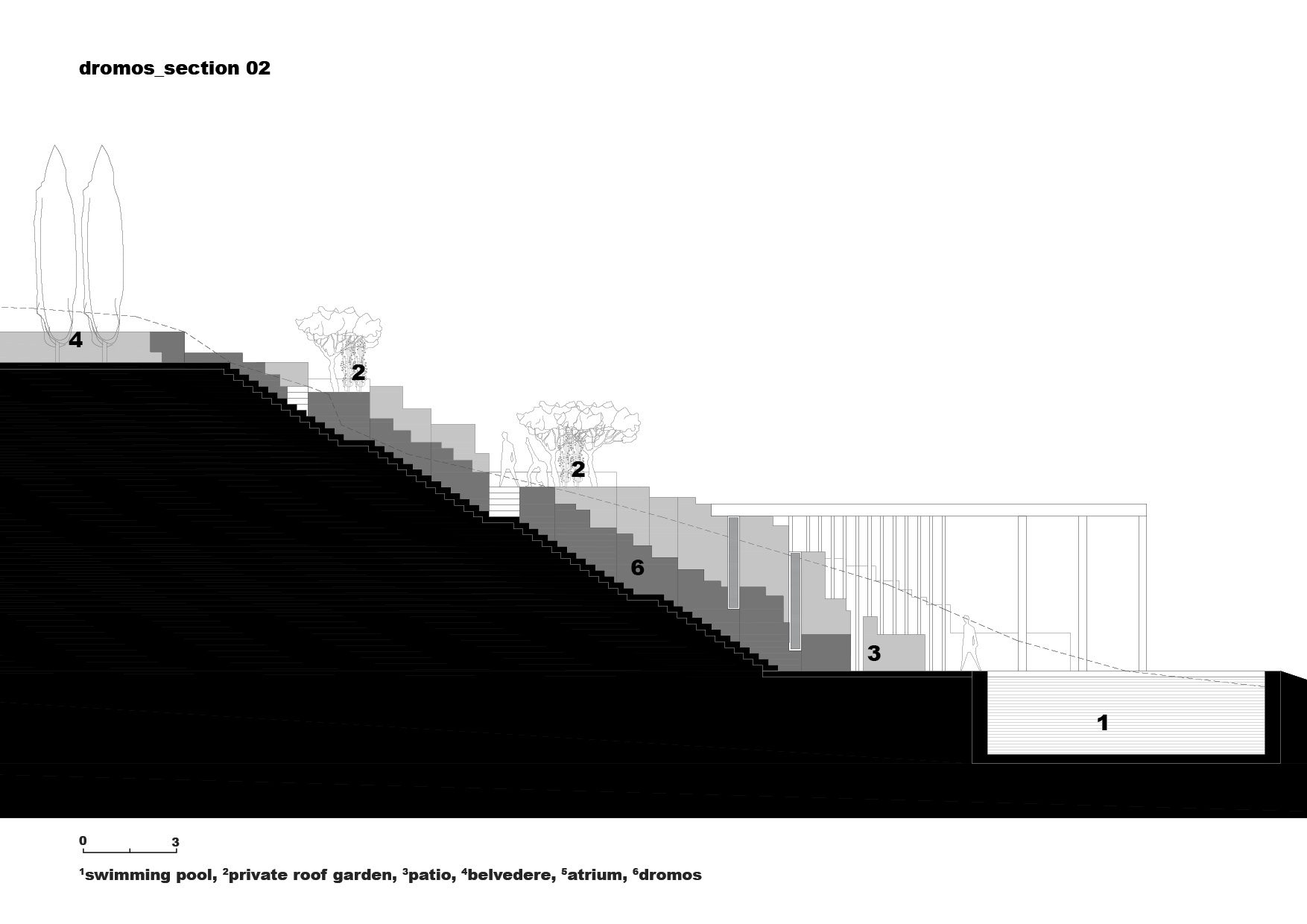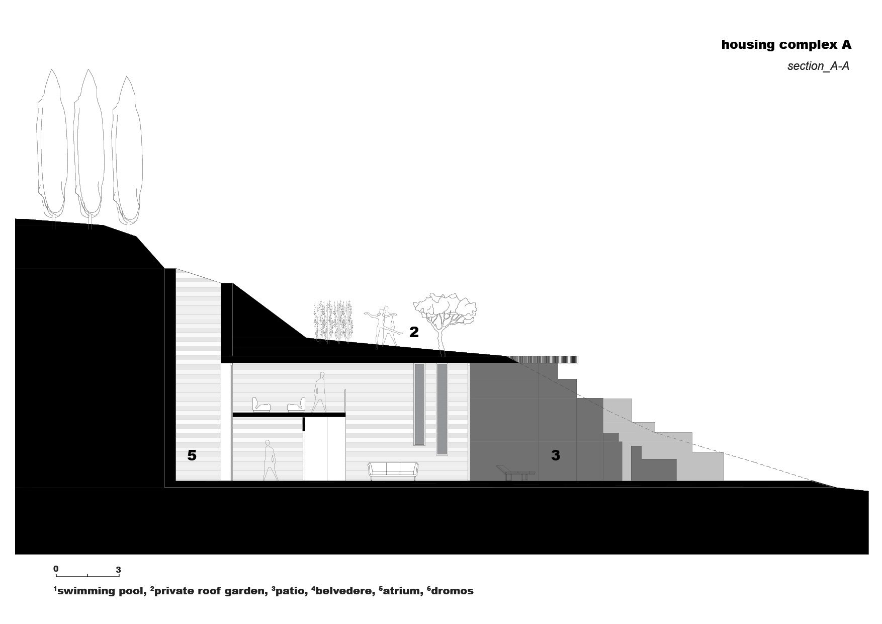 Η εγκάρσια αυτή κίνηση – τομή δίνει τέλος τη δυνατότητα πρόσβασης στα φυτεμένα δώματα των κατοικίων – αξιοποιώντας τα ως ιδιωτικούς κήπους με θέα στη θάλασσα.