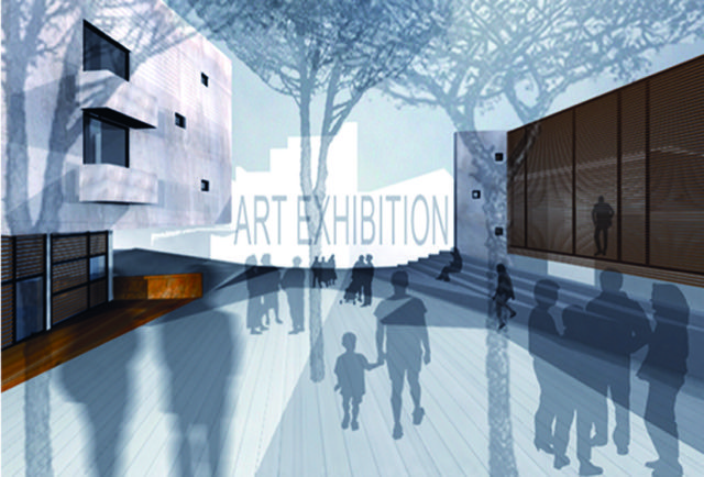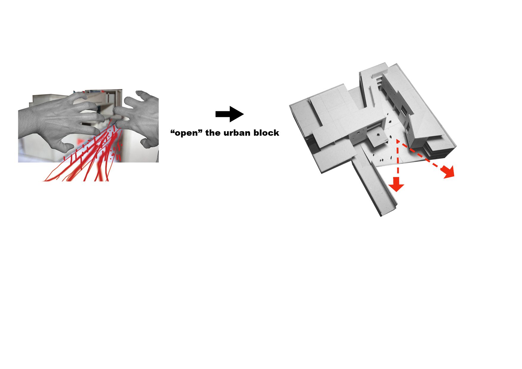 Εντοπίζουμε στην περιοχή μελέτης ένα δίκτυο χώρων δημιουργίας («εικαστικός κύκλος»). Στόχος του σχεδιασμού είναι η αλληλεπίδραση ανάμεσα στο νέο κτίριο και την πόλη, ώστε να τροφοδοτηθεί ο κύκλος δημιουργίας με οφέλη και προς τις δύο πλευρές. Βασικό στοιχείο της σύνθεσης αποτελεί η πίσω όψη του διατηρητέου που διατρέχει το οικόπεδο. Προτείνουμε τη διατήρηση και ανάδειξή της ως «μπροστινή» όψη στη λύση. Κεντρική ιδέα της πρότασης είναι η δημιουργία ενός εσωτερικού δικτύου καλλιτεχνικής δράσης.