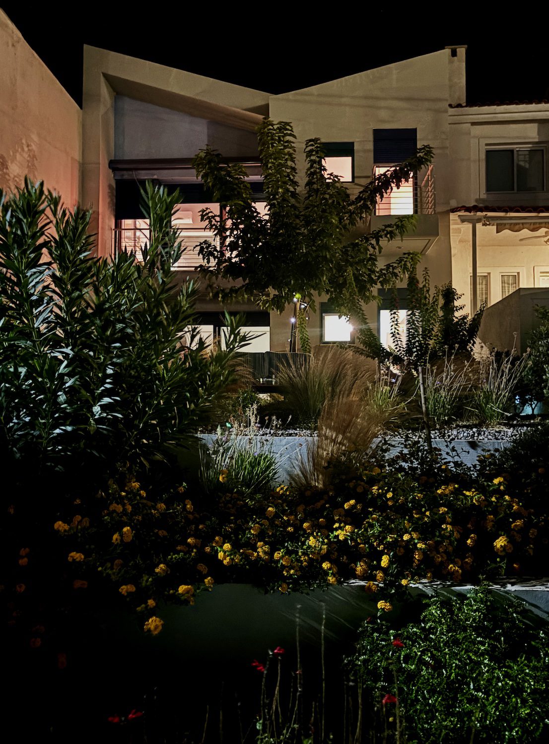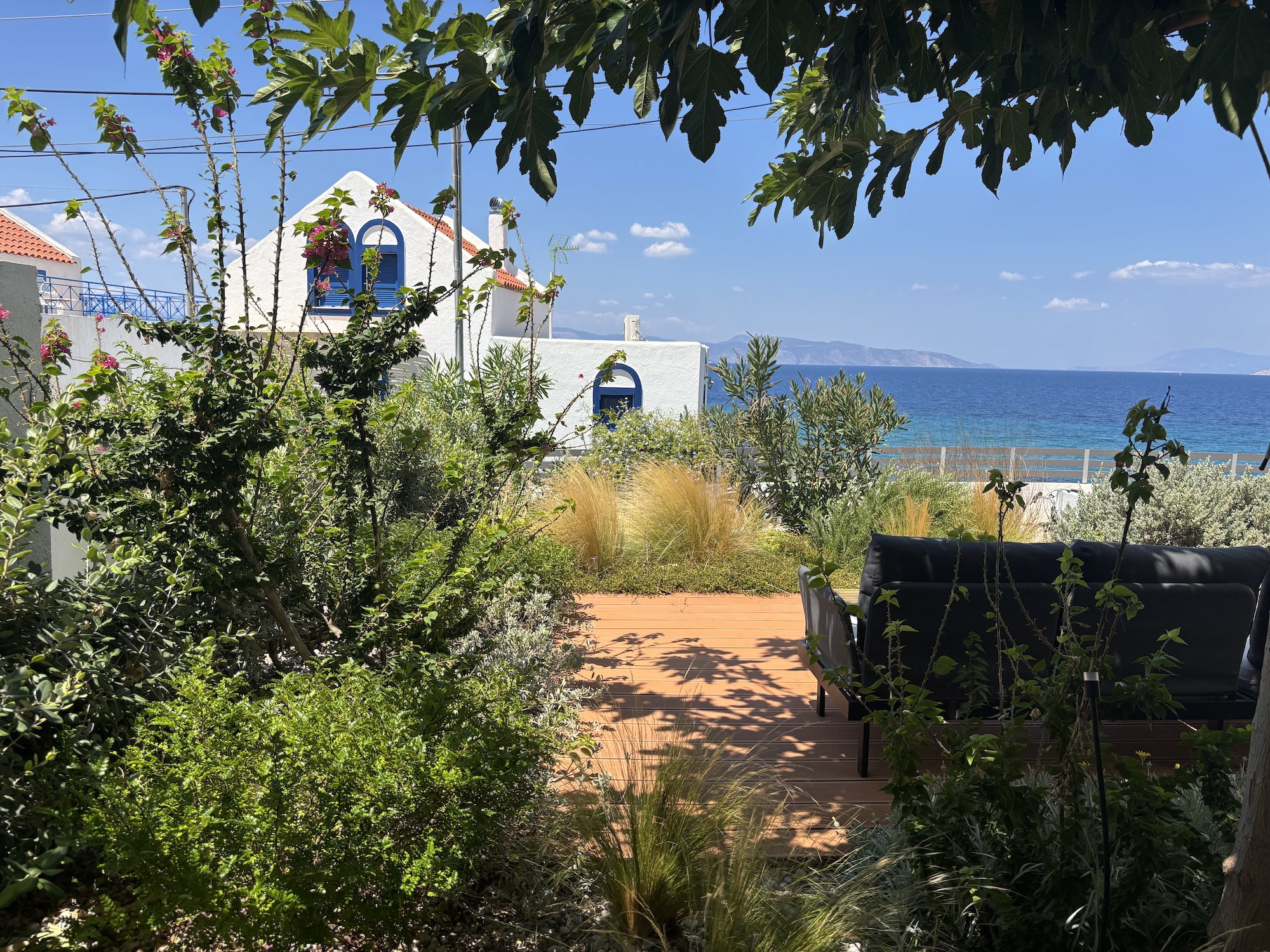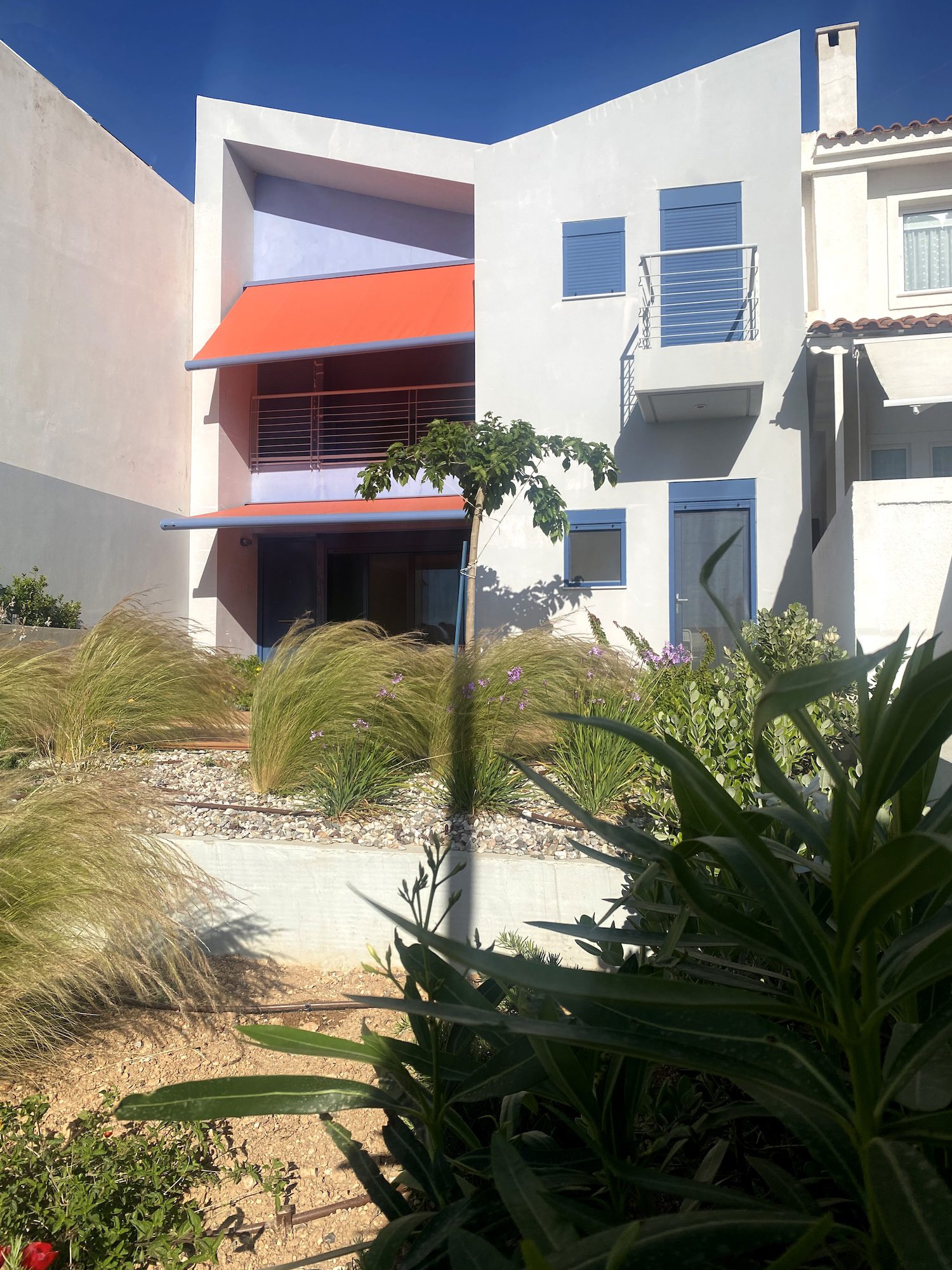 The Concept: The design envisions the house as an uninterrupted journey, offering a series of captivating sea views, beginning from the harbor, continuing through the island, and culminating inside the house with a large window framing the landscape from an elevated vantage point. Moreover, the building’s Z-shaped volume arranges three distinct courtyards, each dedicated to private outdoor activities.Currently, the landscape surrounding the house is undergoing construction. The proposal centers on the incorporation of natural materials, along with local flora and vibrant shading systems. Likewise, the interior of the house embraces a harmonious color palette, blurring the boundaries between the exterior and interior spaces.